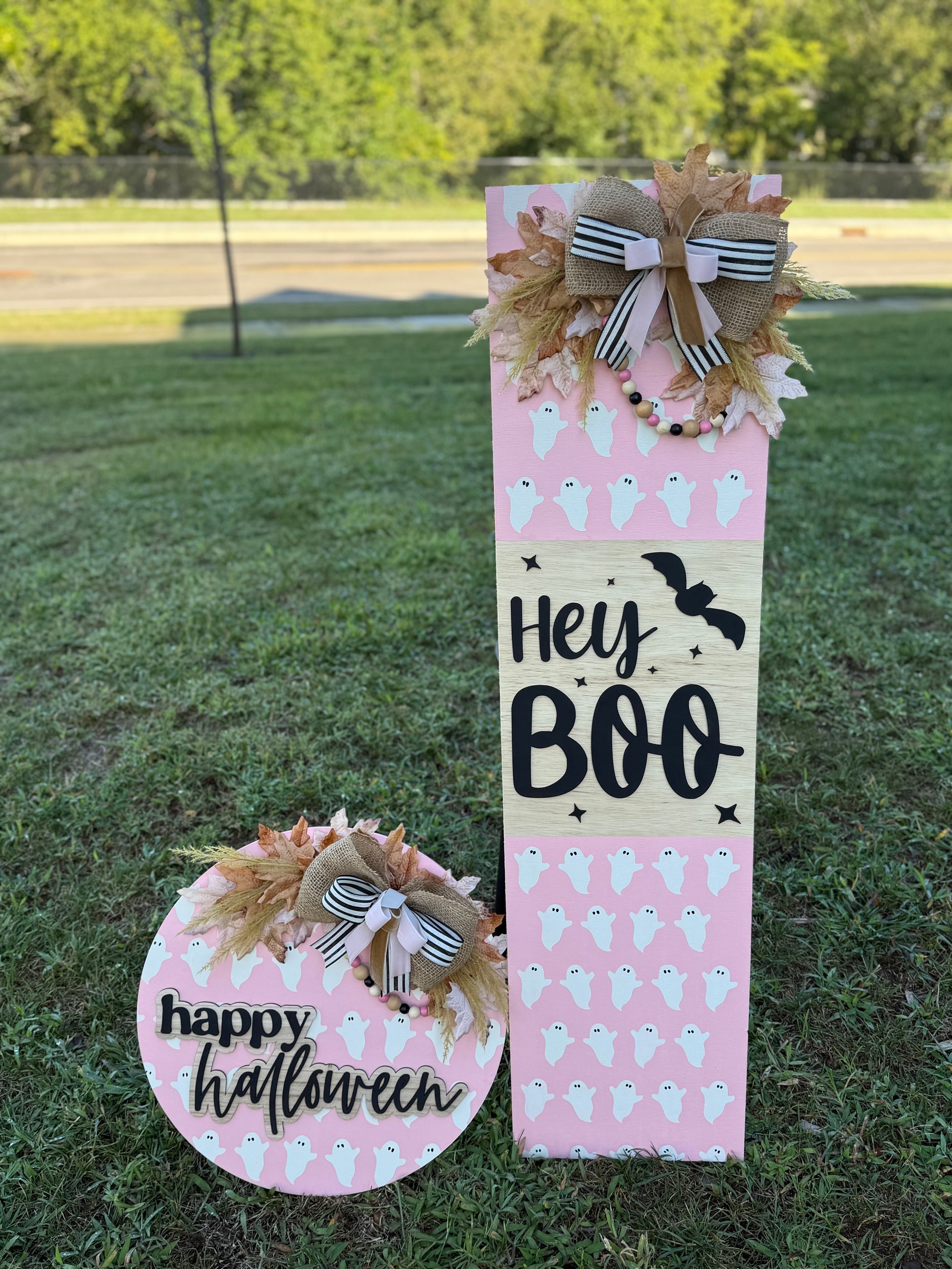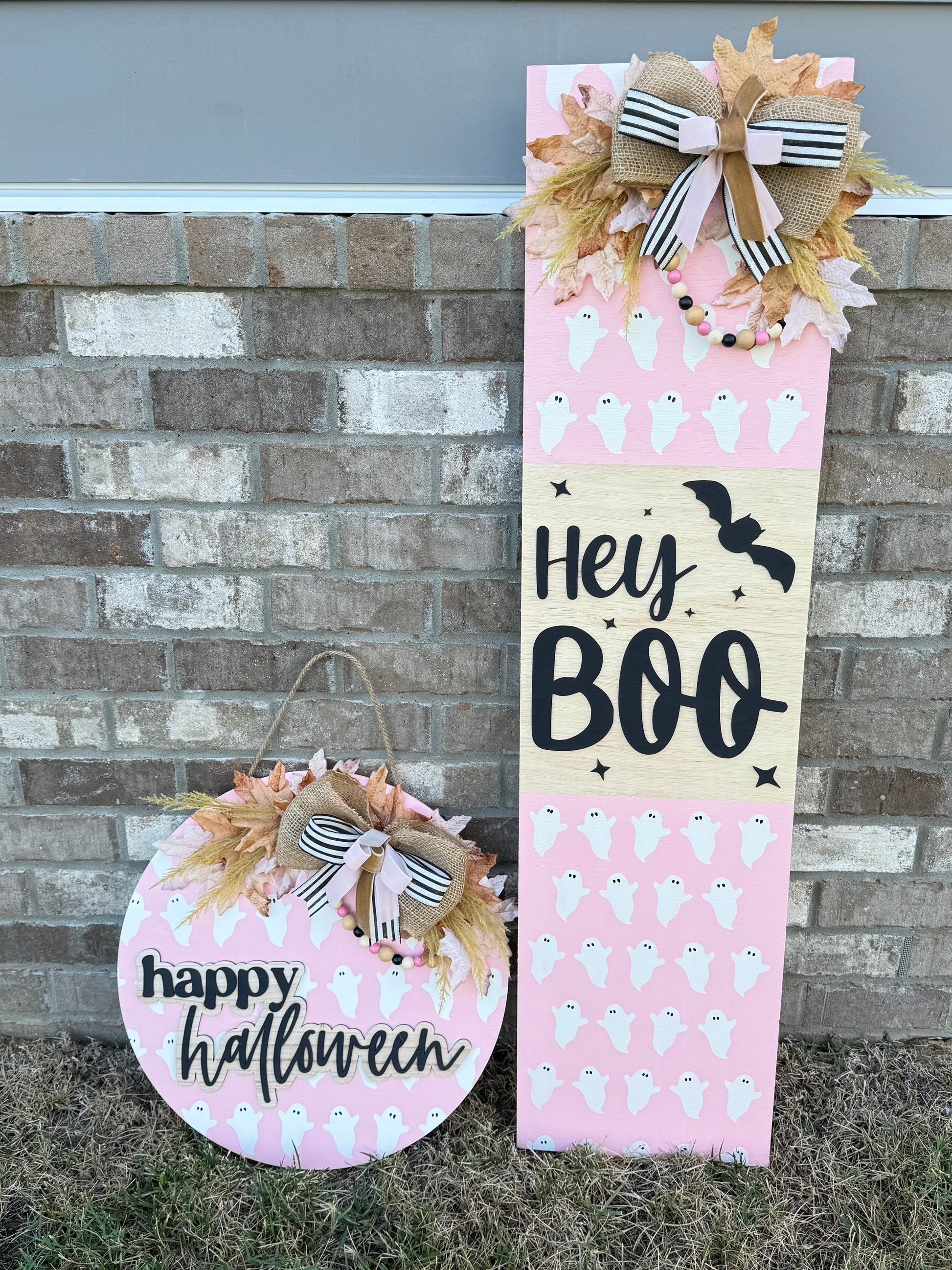 Welcome guests with a smile (and maybe a spook or two) with our Pink Happy Halloween Porch Set. Featuring a quirky "Happy Halloween" door hanger and a matching "Hey boo" porch leaner, along with the cutest little ghosts, this set is perfect for adding a playful touch to your porch decor.